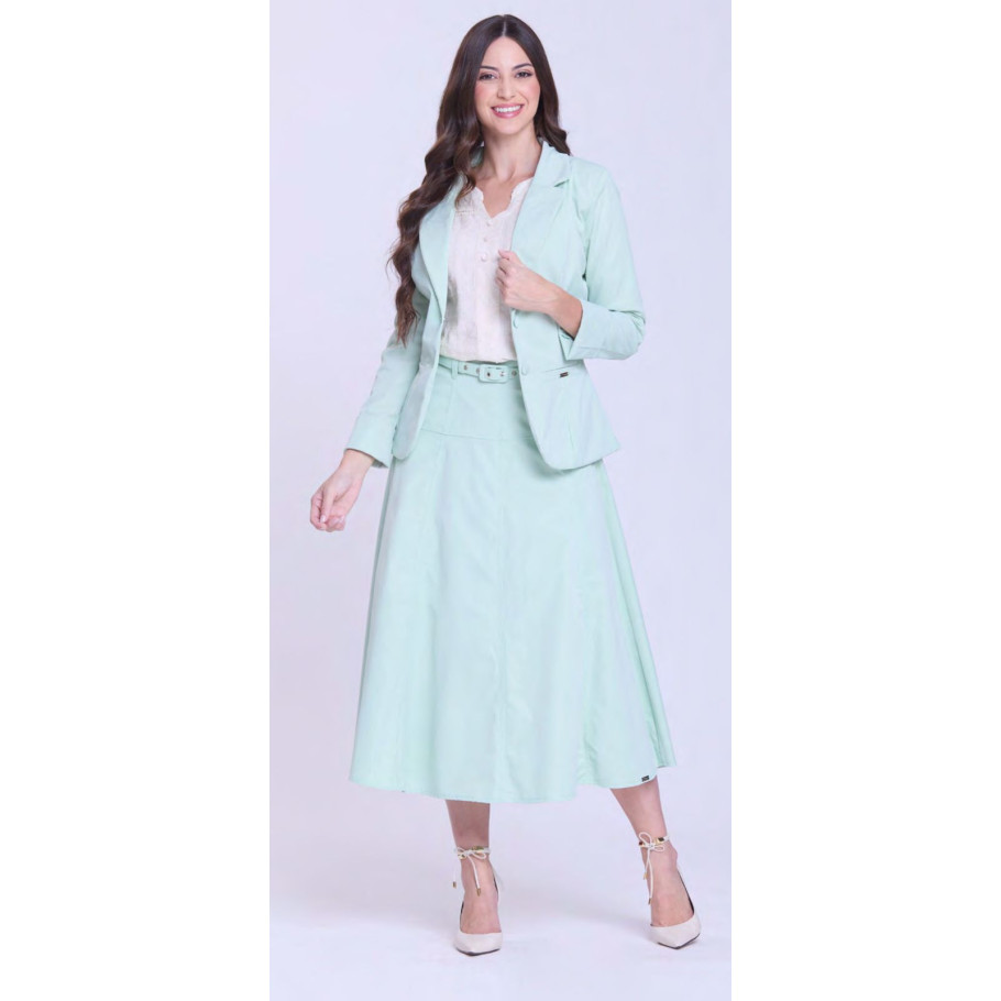 Saia em alfaiataria, forrada, comprimento midi, com cos alto e cinto adicional.