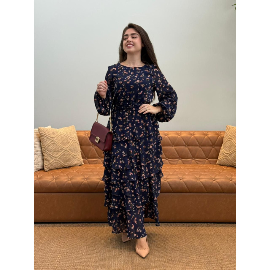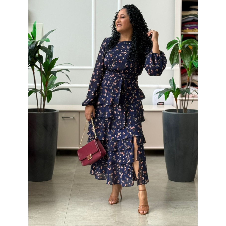Vestido no crepe, forrado, manga longa, saia com babados , acinturado com recortes , estampa floral exclusiva.