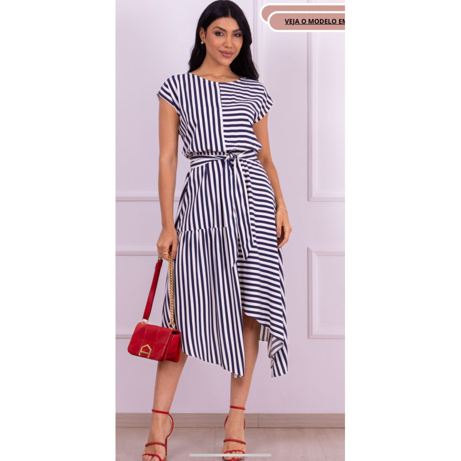 Vestido em viscose , com estampa em listras, trabalhado assimetrico na saia.