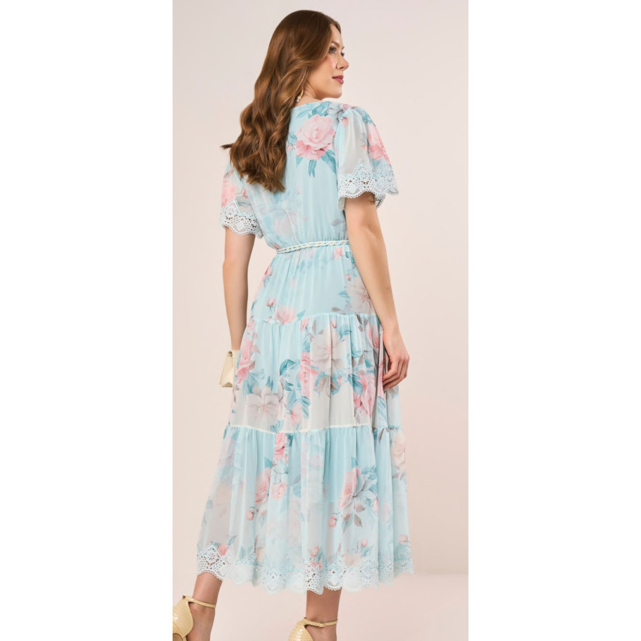 Vestido midi decote canoa, estampa floral,saia maria, confeccionado no crepe de seda, manga flare com renda guipir na manga e na barra da saia