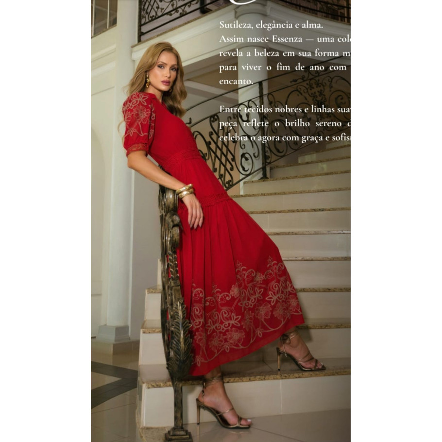 vestido com gola padre, detalhe de guipir na frente , manga bordada, no tecido