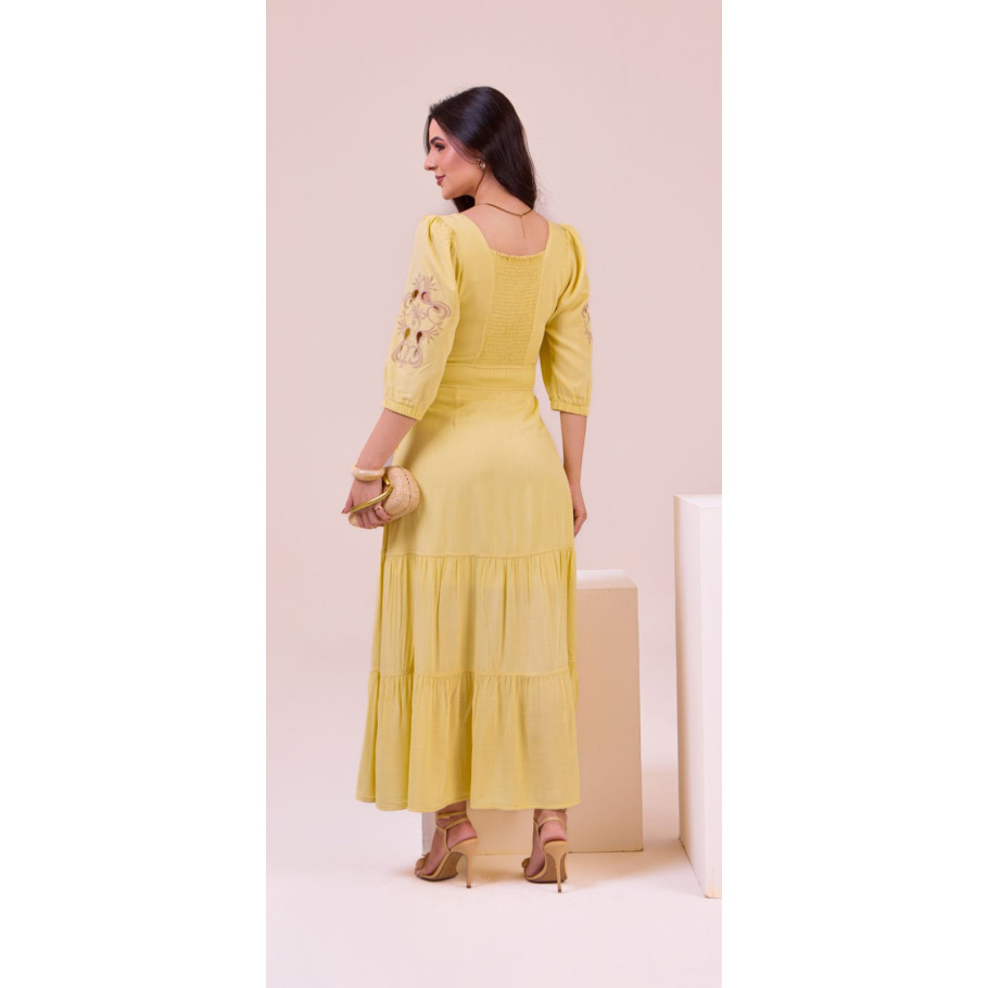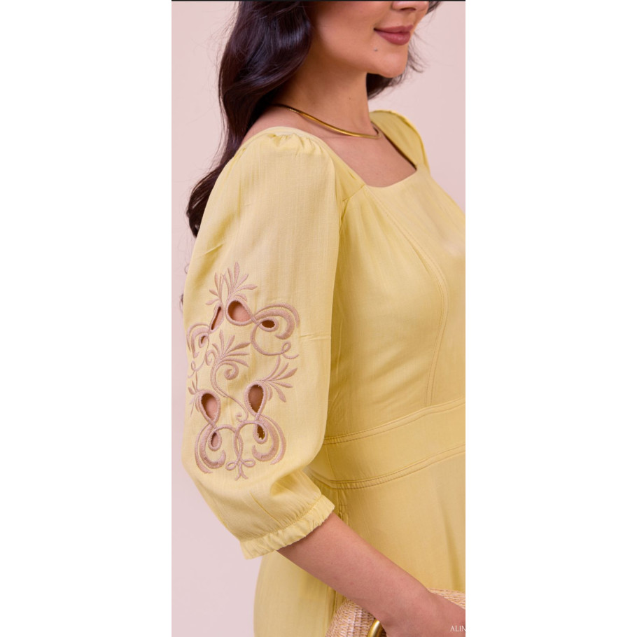 Vestido confeccionado no viscolinho, cor marinho, decote quadrado, manga