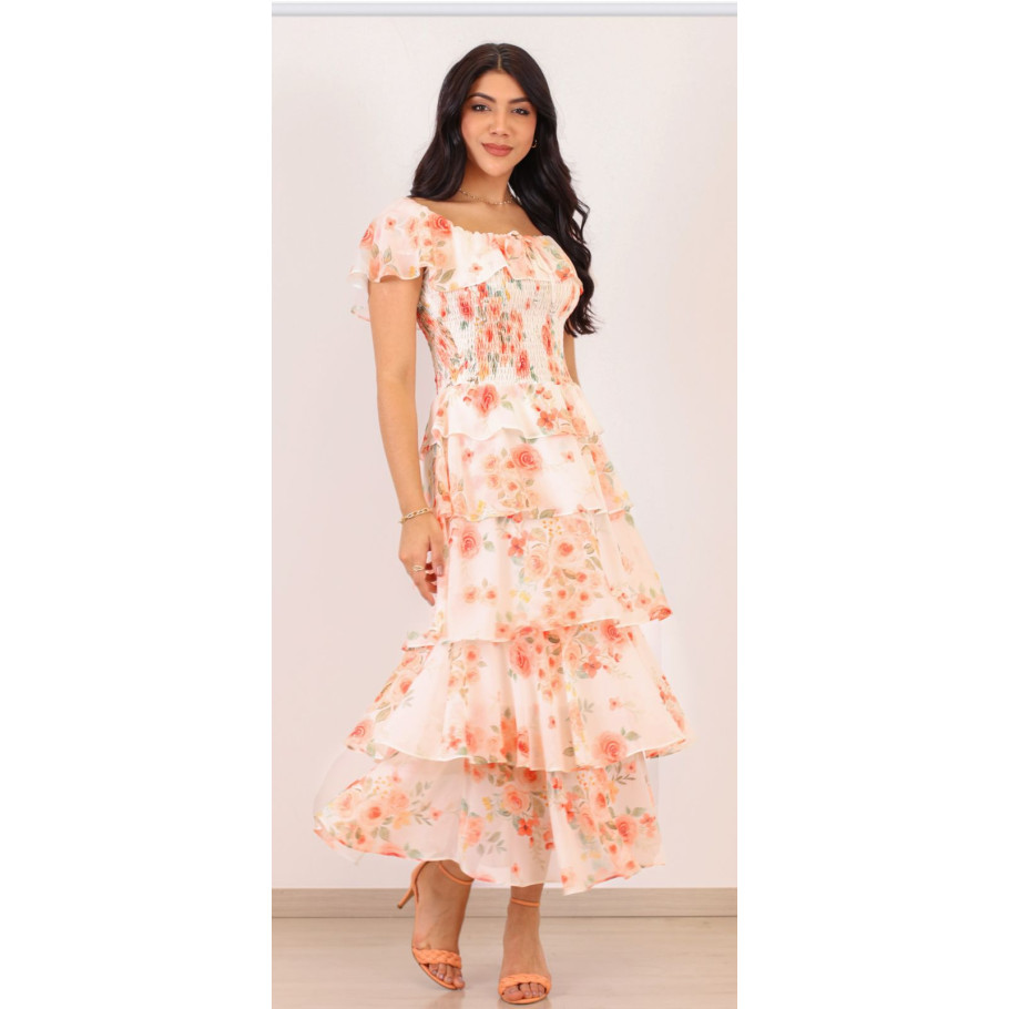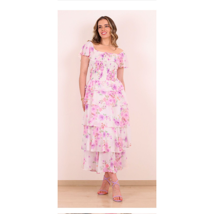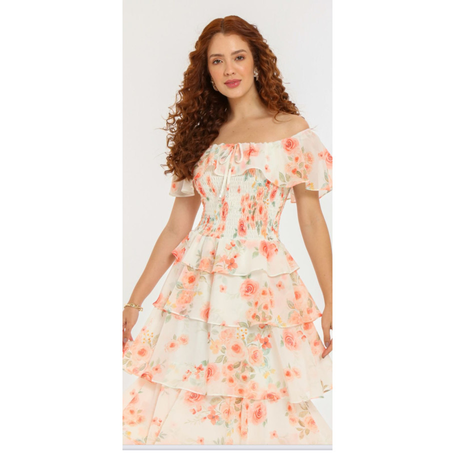 Surpreenda com esse modelo em crepe com estampa floral exclusiva, decote quadrado com elastico e babado sobreposto, lastex no corpo, saia com babados , comprimento longuete .